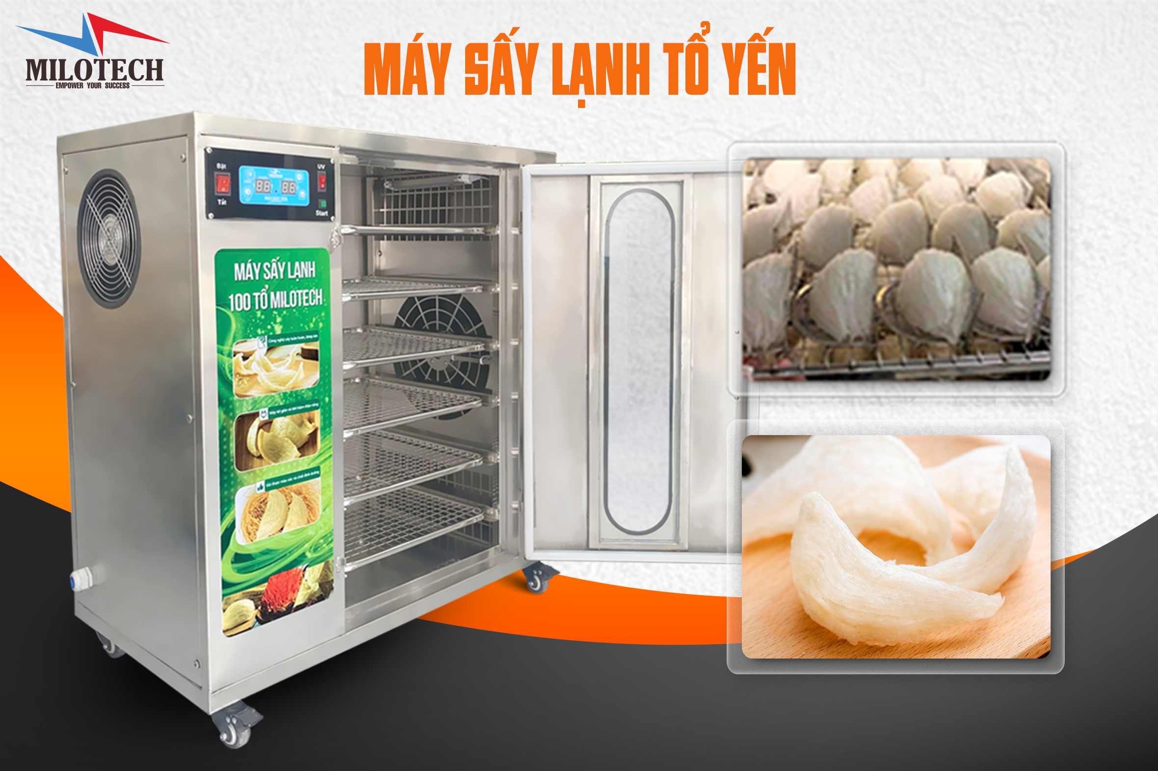 Máy sấy lạnh tổ yến MILOTECH là dòng thiết bị tối ưu cho cơ sở yến từ 50–500 tổ/mẻ, giúp tách ẩm từ từ ở nhiệt độ thấp để giữ sợi yến đẹp, màu tự nhiên và độ đồng đều cao. Nhờ nhiều cấu hình dung tích và số khay linh hoạt, máy hỗ trợ doanh nghiệp tăng năng suất, giảm hao hụt và vận hành ổn định khi mở rộng sản lượng.