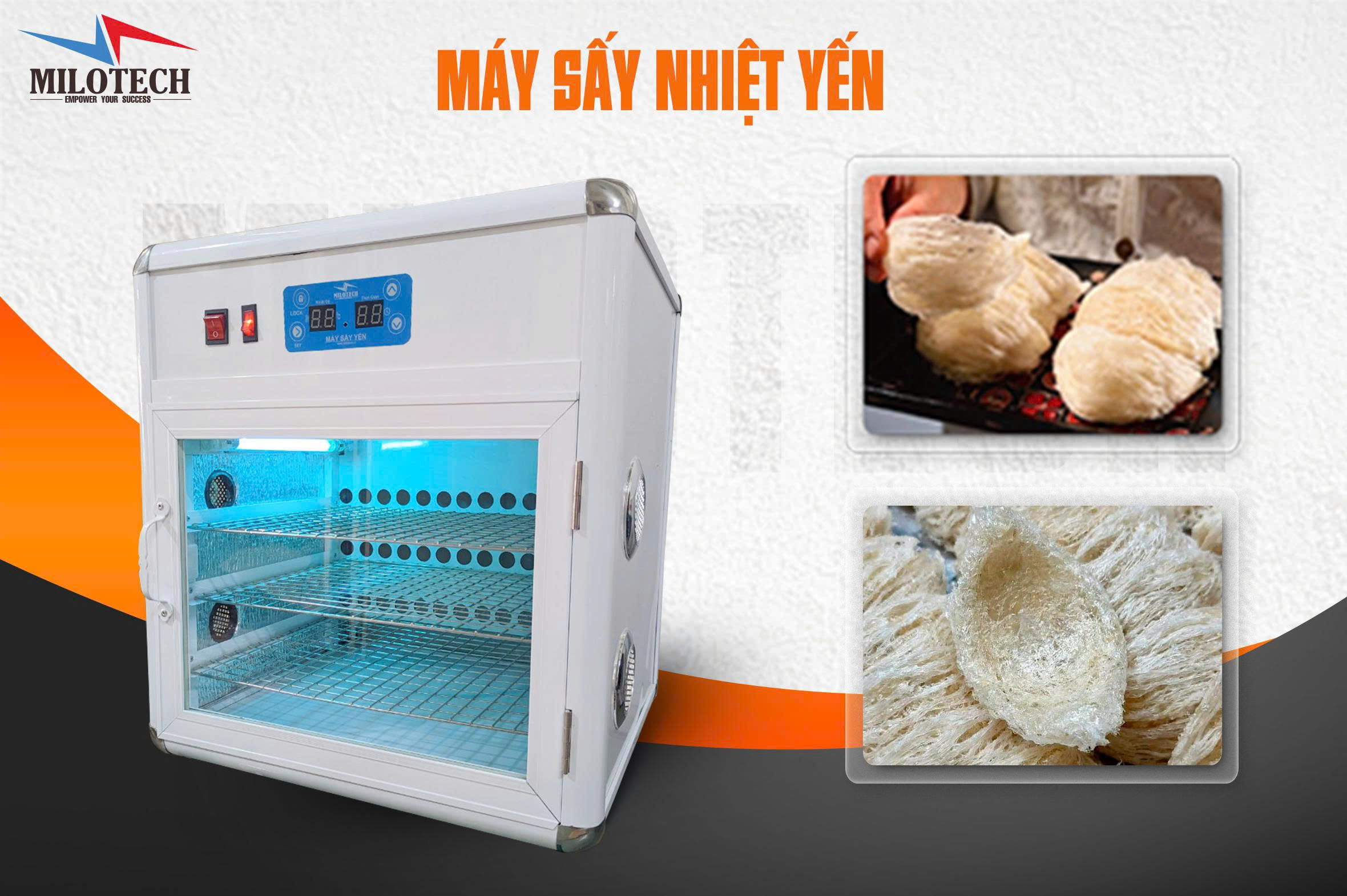 Máy yến sấy nhiệt là thiết bị chuyên dụng sử dụng nhiệt độ ổn định kết hợp đối lưu không khí để làm khô tổ yến sau công đoạn làm sạch và định hình.