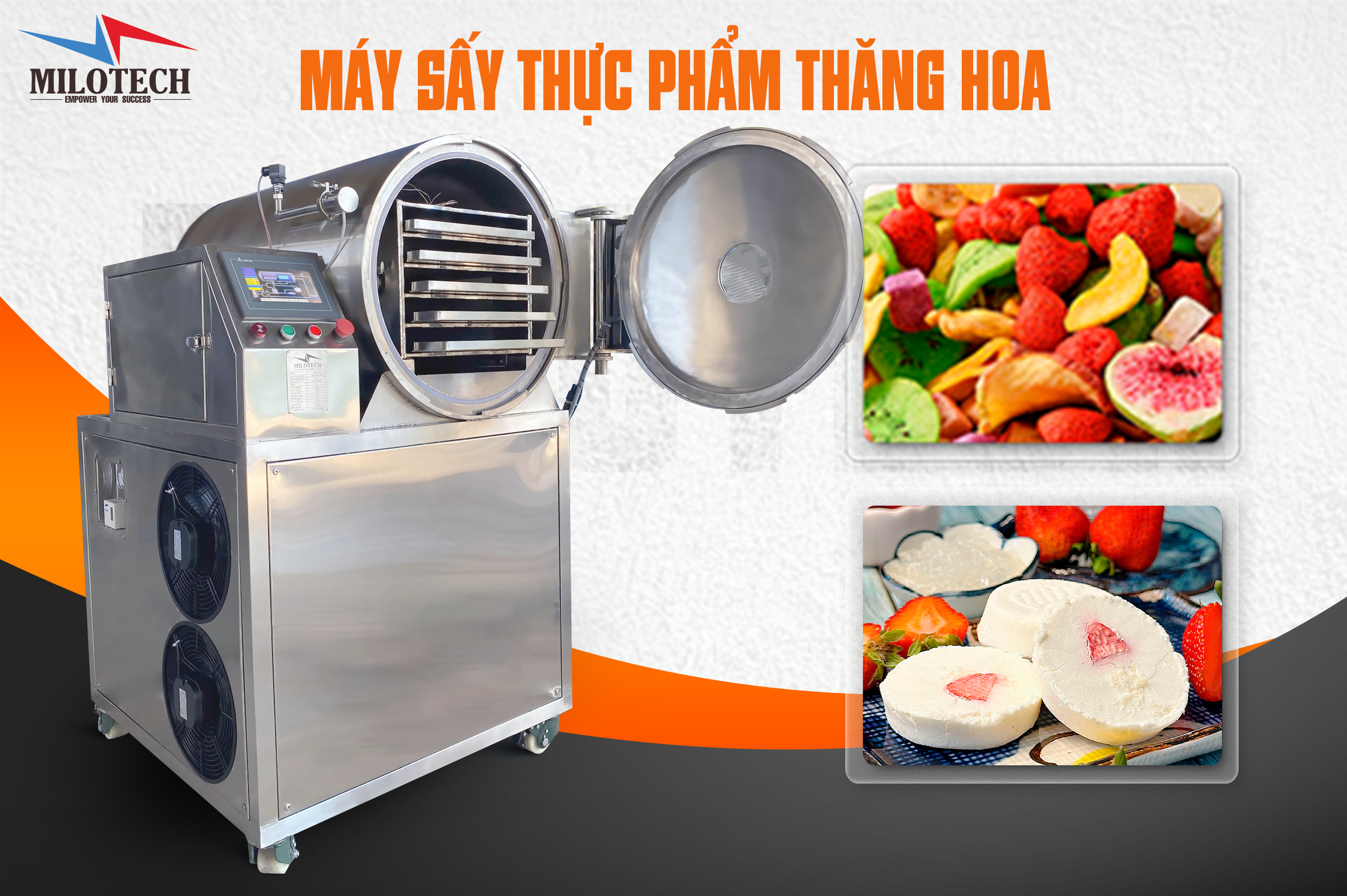 Máy sấy thăng hoa MILOTECH ứng dụng công nghệ cấp đông sâu kết hợp môi trường chân không để loại bỏ nước khỏi sản phẩm thông qua quá trình thăng hoa.