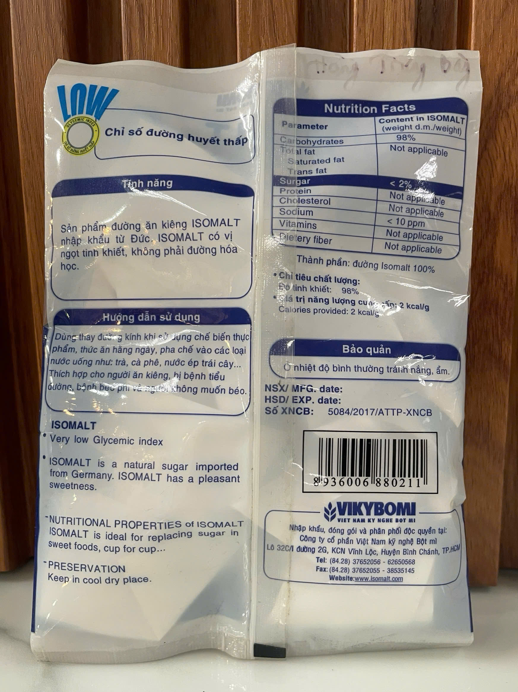 • Isomalt có dạng tinh thể trắng, vị ngọt dịu tự nhiên, gần giống đường mía nhưng ít ảnh hưởng đến đường huyết.