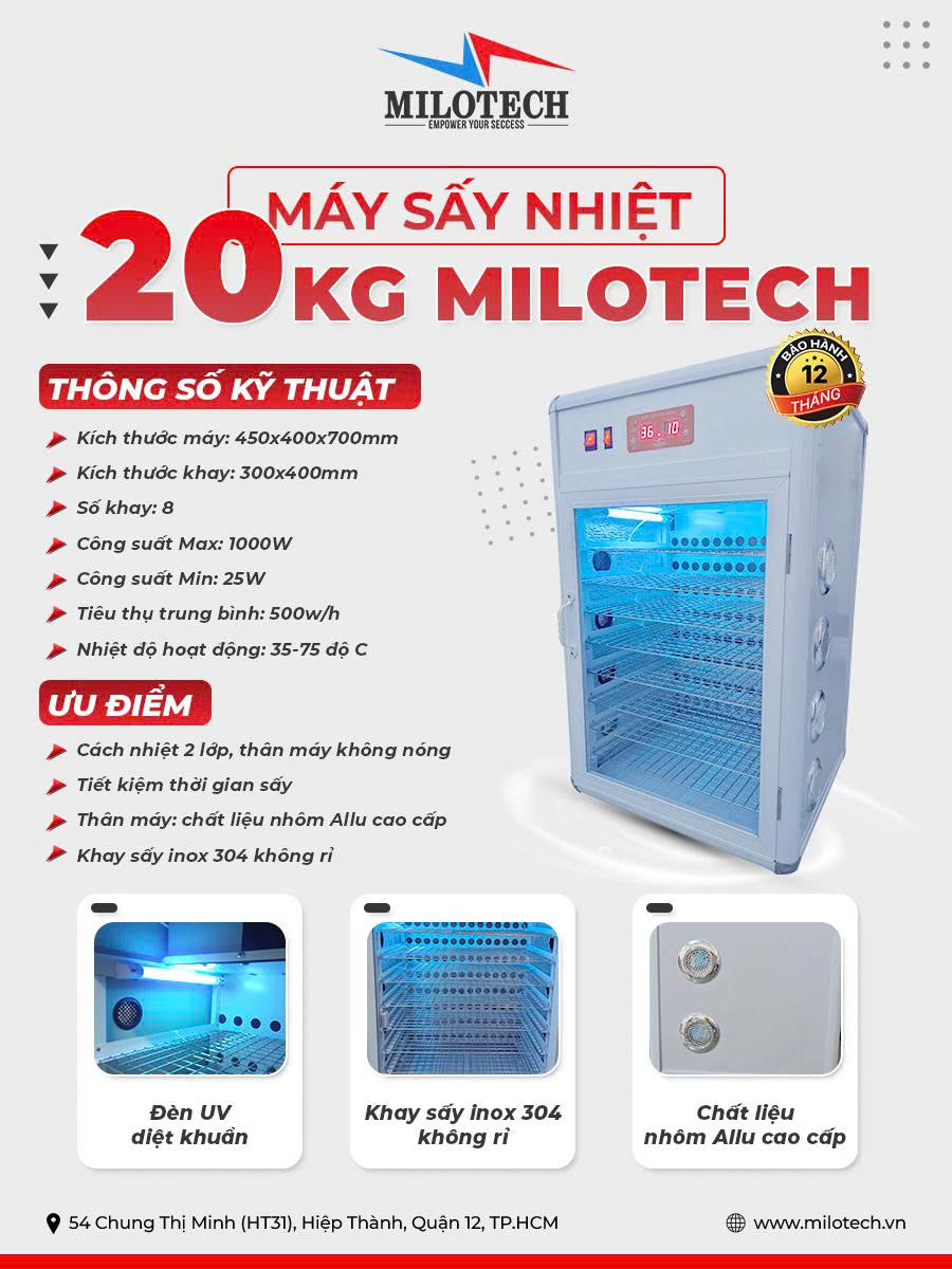 Máy sấy nhiệt thực phẩm Milotech 20kg (khung nhôm)