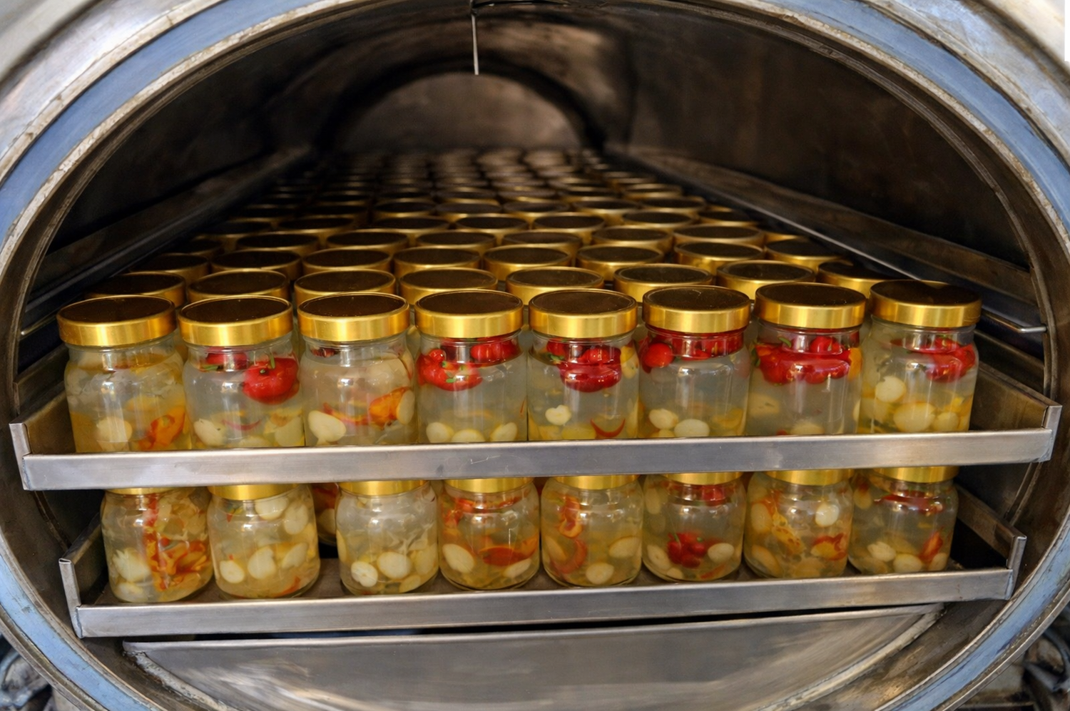 - Xếp lon vào giỏ/khay với mật độ phù hợp để hơi nước lưu thông đều